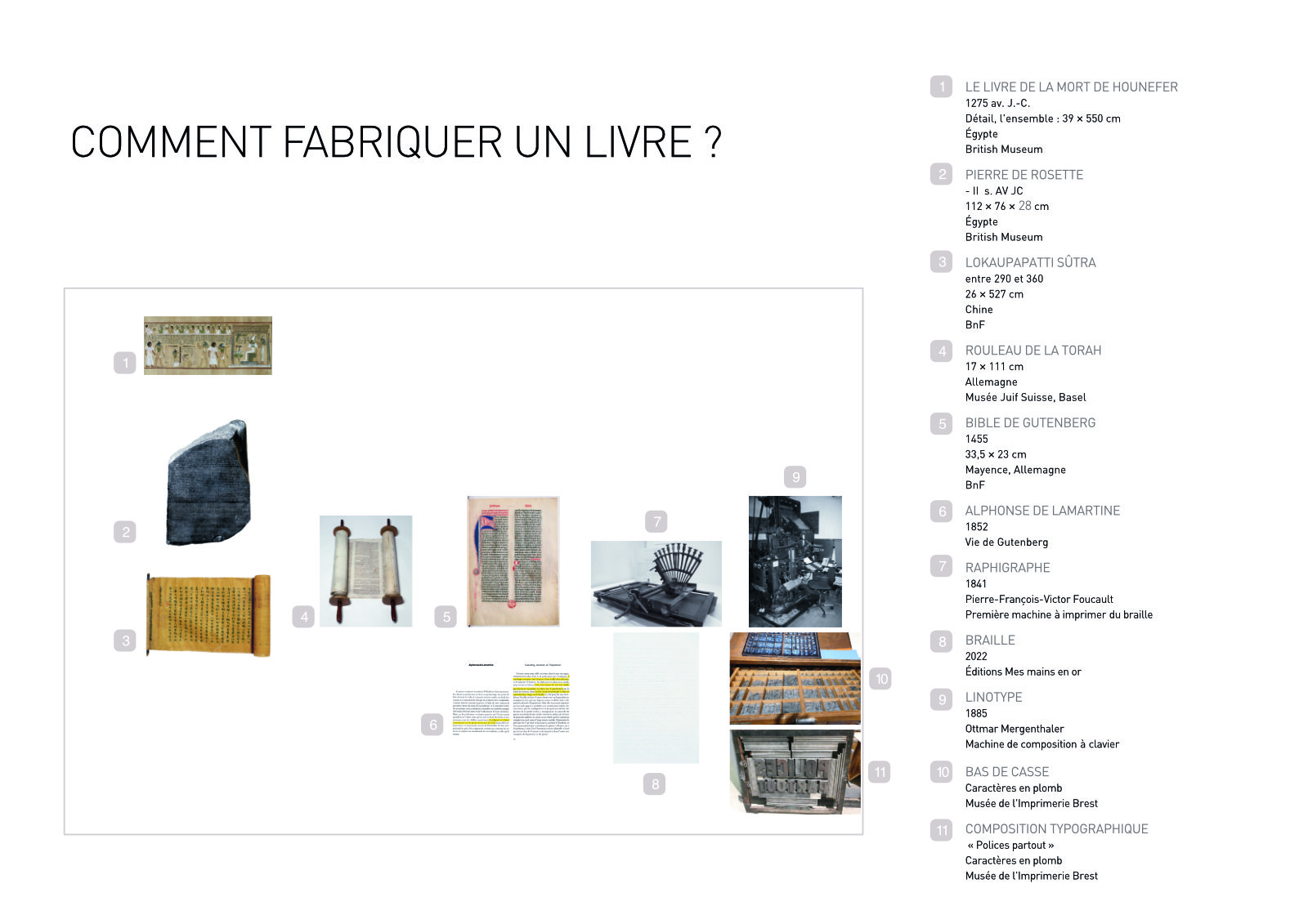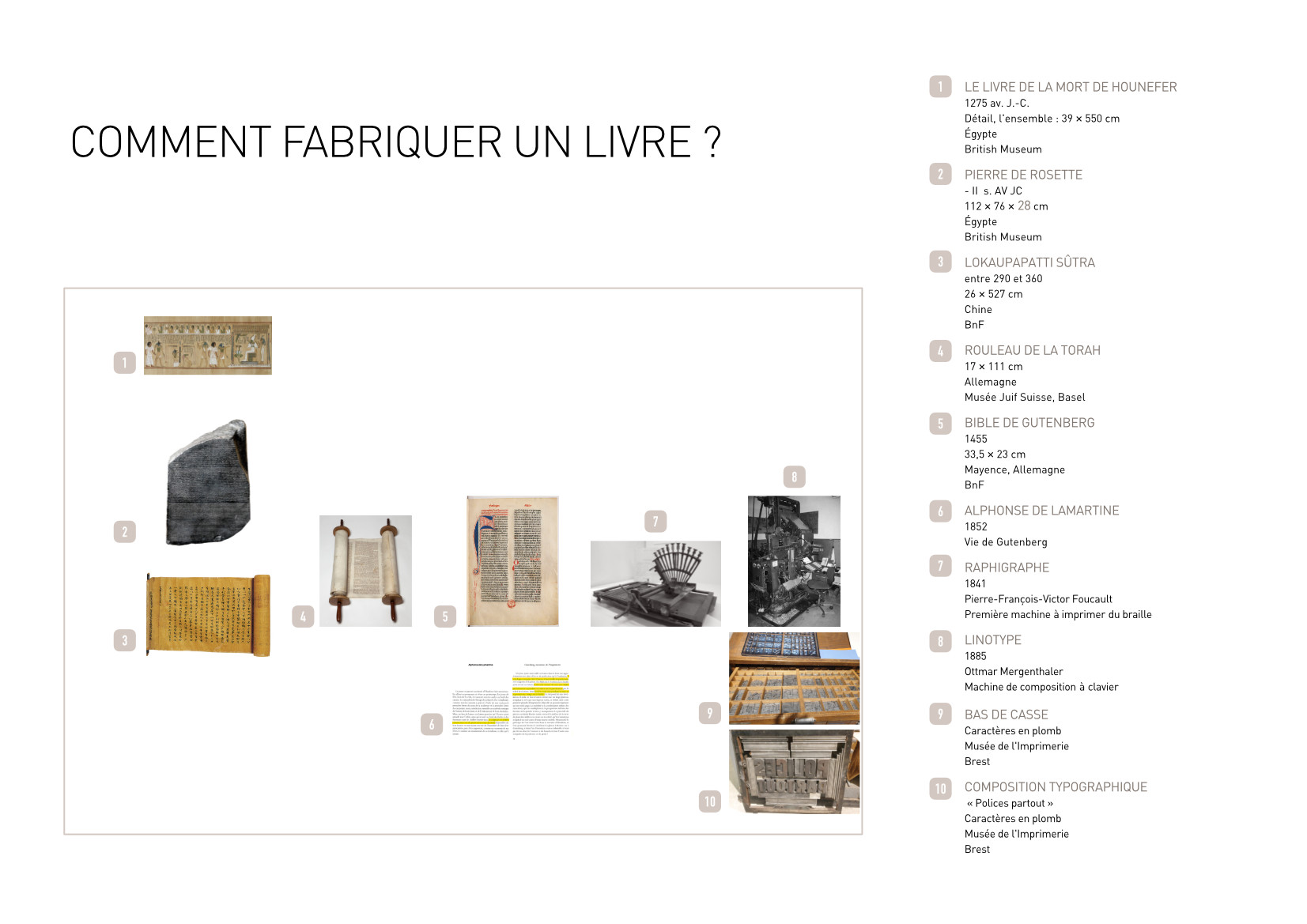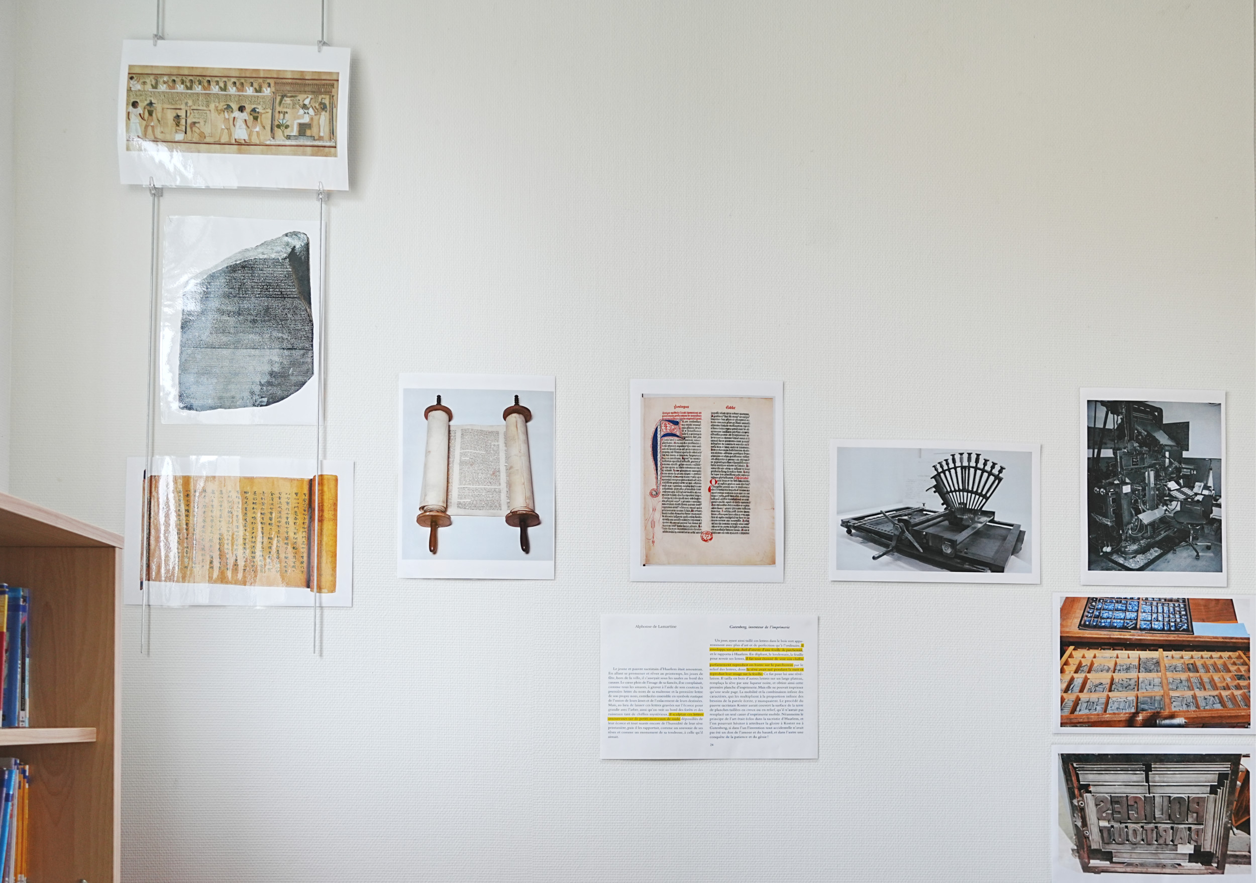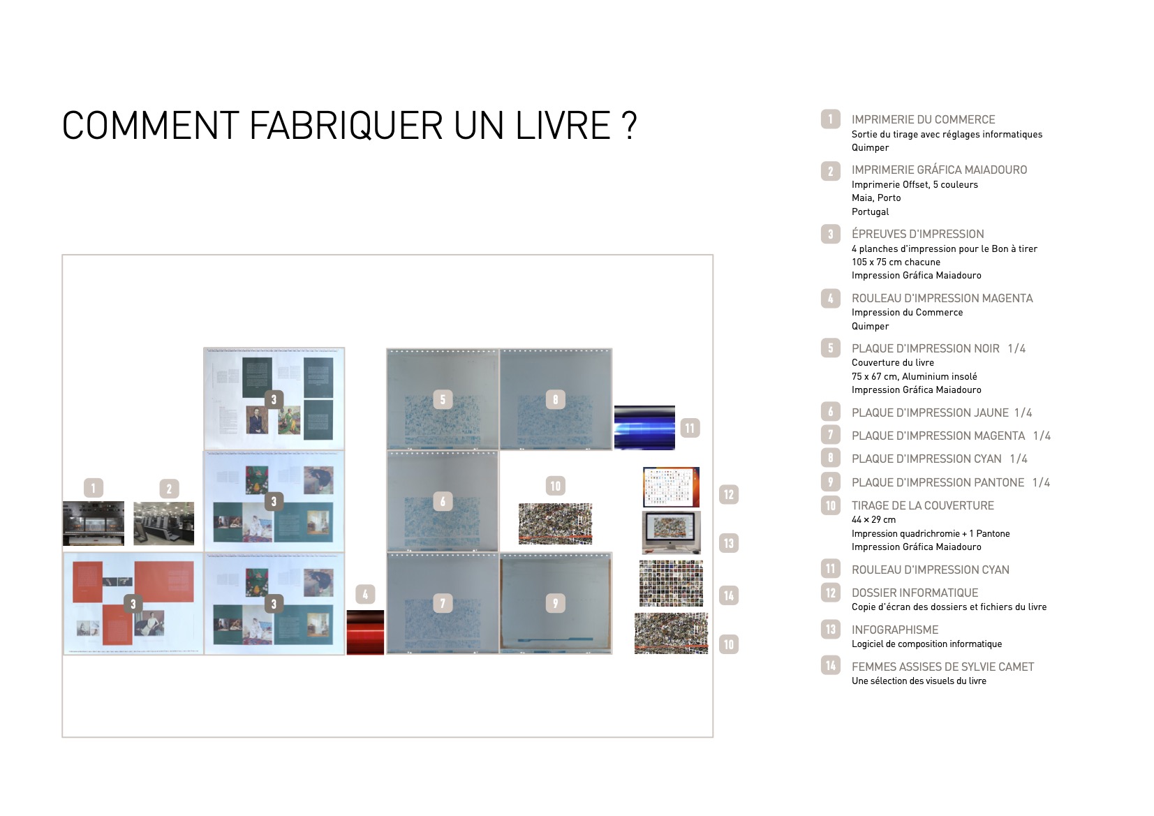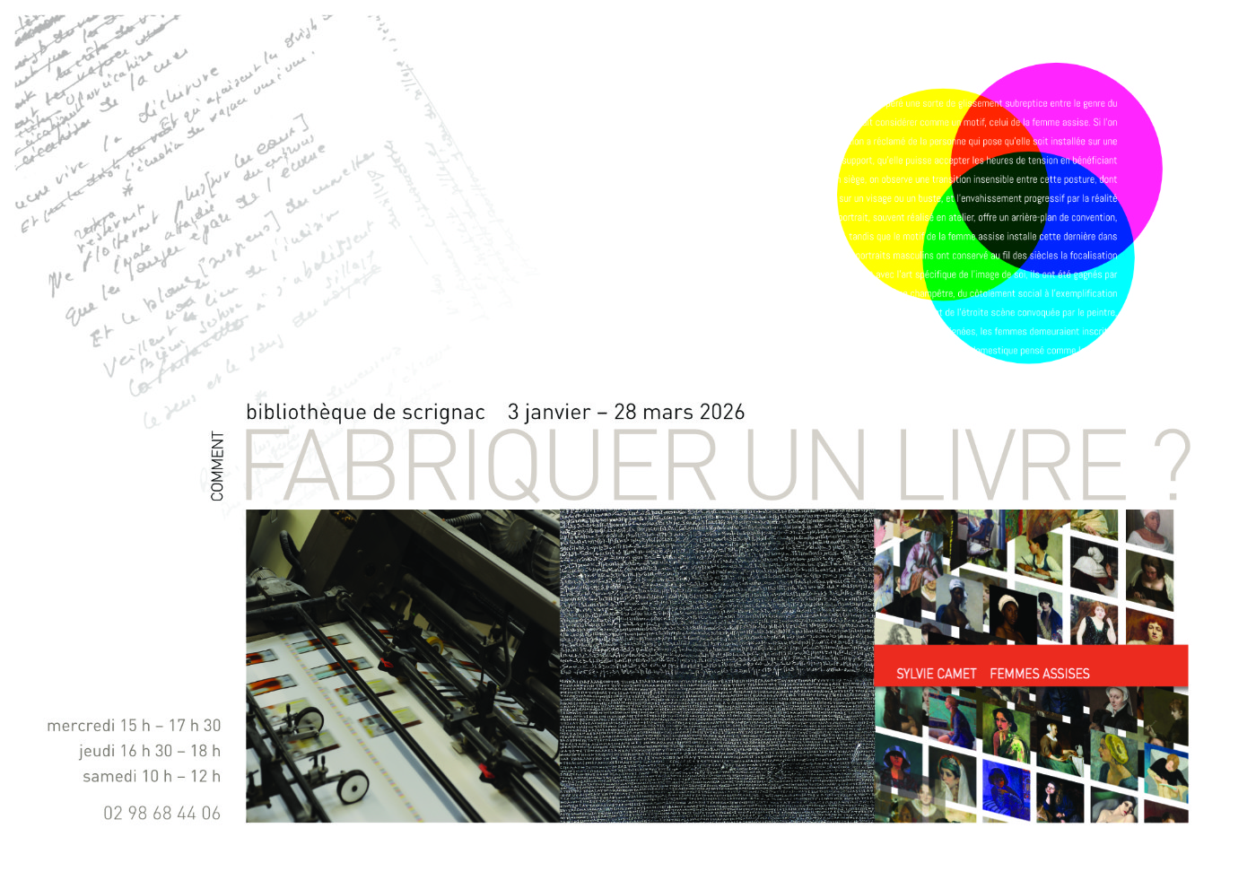 À partir de l’ouvrage Femmes assises de Sylvie Camet, cette exposition montre le processus de fabrication matérielle d’un livre, depuis la composition sur ordinateur, jusqu’aux matériels utilisés dans l’imprimerie : plaques d’impression en quadrichomie, feuilles d’épreuves, etc. Un petit film montre toutes les étapes de l’assemblage d’un ouvrage, de l’encrage, au façonnage. Des caractères au plomb sont également exposés pour illustrer une étape de l’histoire du caractère imprimé, aujourd’hui remplacé par l’infographie. Parallèlement à la dimension technique, une fresque historique montre quelques jalons de l’invention de l’écrit, avant le livre, depuis le marbre gravé, le papyrus, l’invention de Gutenberg à l’époque de la Renaissance, ainsi que les procédés techniques modernes, aboutissant aux presses actuelles.